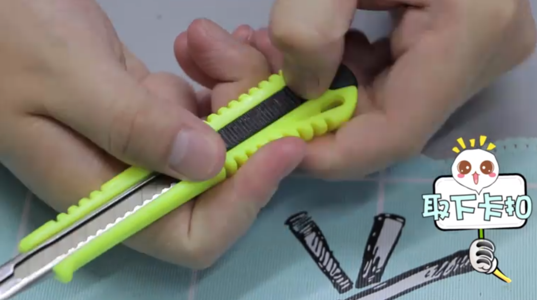 第一步是取下美工刀尾部的卡扣,后續可用于掰斷刀片,防止皮膚劃傷。
